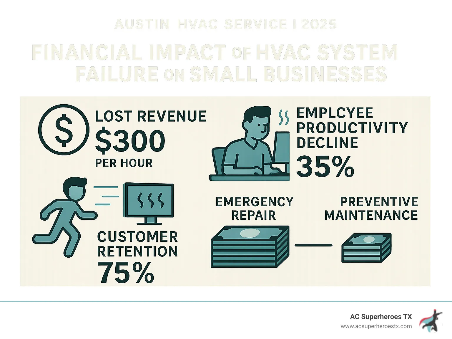 For Austin businesses, the stakes are high. A single HVAC failure can shut down operations, drive away customers, and cost thousands in lost revenue. Employees become less productive in uncomfortable conditions, while customers flee to competitors with working air conditioning.